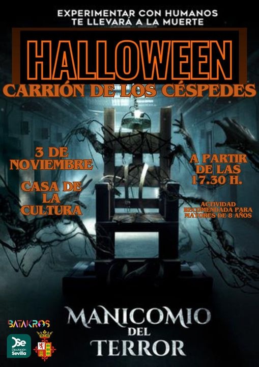 A partir de las 18:00h hasta las 19:30h, el Manicomio del Terror abre sus puertas en la Casa de la Cultura. Entradas gratuitas e ilimitadas por grupos reducidos. Actividad recomendada para mayores de 8 años.